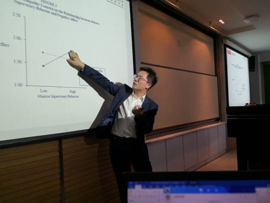 2018年5月24日上午,对外经济贸易大学国际商学院黄鸣鹏副教授,以及上海科技大学创业与管理学院周小宇助理教授做客365官网,分别作题为The short-lived benefits of abusive supervisory behavior for actors: An investigation of recovery and work engagement以及Corporate social responsibility and financial market reactions的两场学术报告。365官网工商管理系张三保副教授主持本次学术研讨会,来自院内外的20余名教员及博士、硕士和本科生参加了讲座。